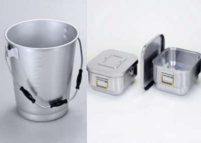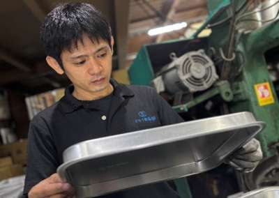 プレス加工・スピニング加工・アルマイト加工などの設備を備え、一貫生産により安定した品質と短納期を実現。耐久性に加えて衛生面にも配慮した製品づくりで全国の給食現場や食品関連分野に貢献しています。