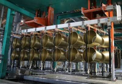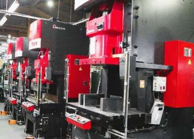 アルミの平板や丸板を金型にはめ圧力を加えて成形する工程です。