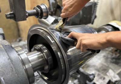 アルミ材を回転させ、ローラーで少しずつを材料を伸ばす加工です。