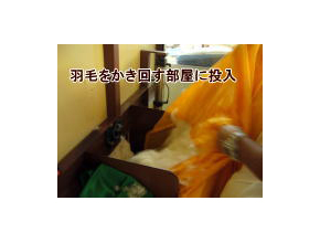 羽毛原料を撹拌するために、羽毛をかき回す部屋に投入羽毛に空気を含まします。 -