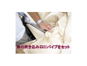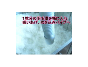 布団の付聞き込み口にパイプをセットして羽毛を吹き込みます。 -