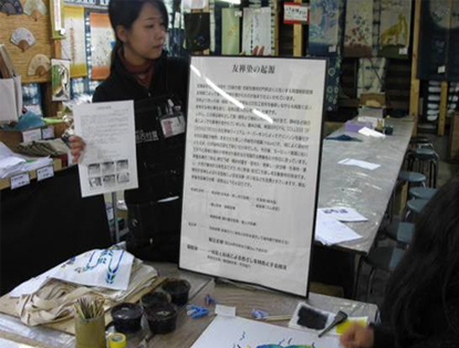 体験時には「友禅染とは?」を分かりやすく説明してから体験をして頂いています。このことで、「友禅染」という文化を伝えています。 -