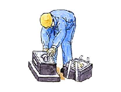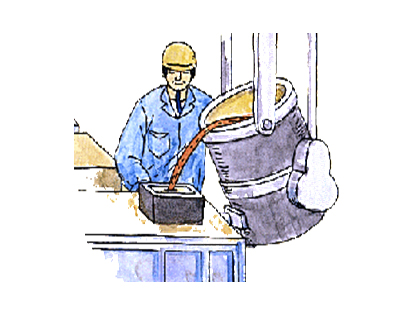 まず、木型(木で作った模型)を枠の中に入れそこに砂を入れて固めます。次に木型を取りだし砂で作った枠を合わせます。 -