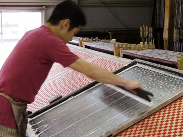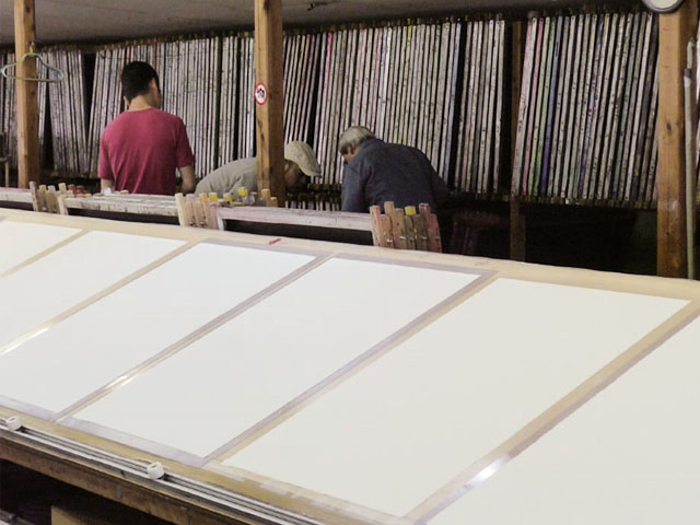 和紙の上に型版をセットし、図案に基づいて正確に調合された顔料を流し込む、特別なヘラで色を上下に擦り込む。1色1色手捺染。 -