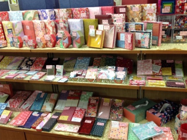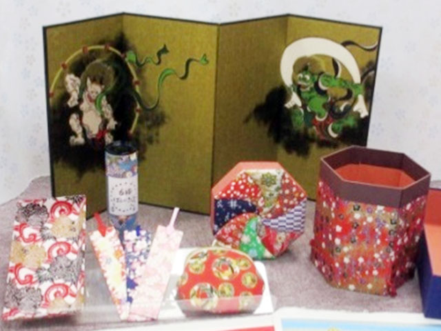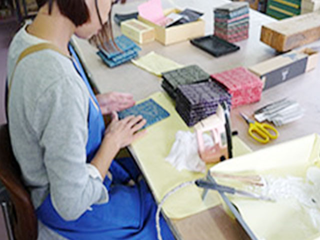 染めあがった友禅紙は、和紙としてだけでなく、様々な小物製品へと加工される。成型、糊付け、裁断など基本的に手作業。