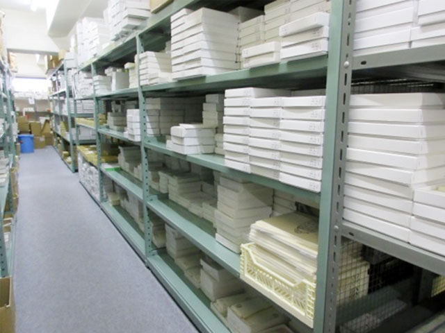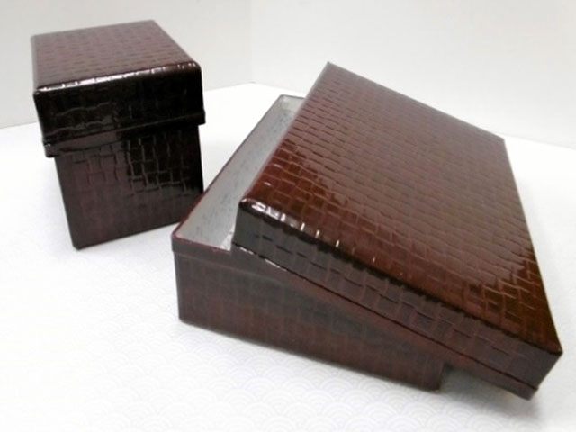 当社は、色紙短冊といった古典的な商品の他に、職人の手仕事を活かした和紙工芸品も企画製造しており、中でも文庫シリーズは、我々の代表的商品の一つです。特に「塗文庫」は、当社の小物商品において定番商品となっています。昔、鰹節屋さんで鰹節を梱包するために葛籠(竹籠に和紙を貼ったもの)を使っていた事にヒントを得て開発しました。原紙に竹編み文様の型を押し付けて、カシュー(カシューナッツを精製したもの)で漆色に仕上げ、葛籠風に仕立てた紙箱です。安価でもあり色々なサイズを用意してインテリアや収納箱として長年ご愛顧をいただいています逸品と言えましょう。
