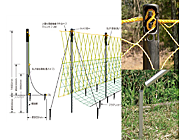 低労力支柱スーパーライトポール(Super Light Pole)は支柱用杭(角パイプ)を打込み、その上から支柱(丸パイプ)をかぶせます。支柱の基礎工事が不要で、施工性が非常に良いことが最大の特徴です。当社開発のポールキャップ「トメジロー」と上張り用低伸度PPロープ「マリンタフOM」 により、上張りロープの施工が簡単かつ確実に行えます。 楽々設置で効果抜群でローコストのため、各自治体や個人の方から高い評価を頂いています。