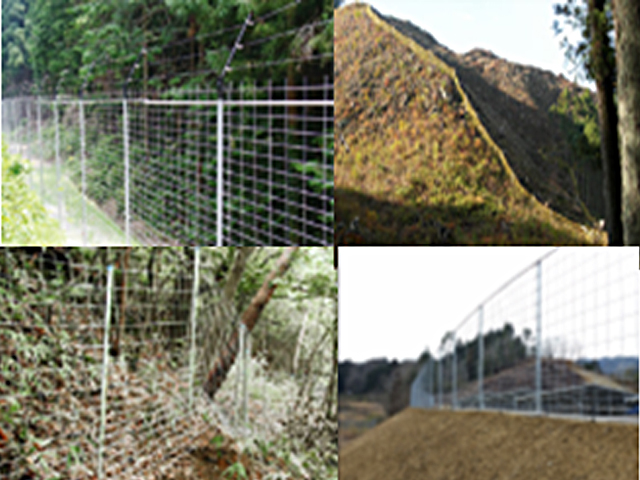 いのしし・鹿・さる獣害防止柵として「イノシッシ」、「ビリビリイノシッシ」の製造販売と設置を行っています。軽量で強力な金属パネルが大切な農作物、苗木、緑化木を護ります。